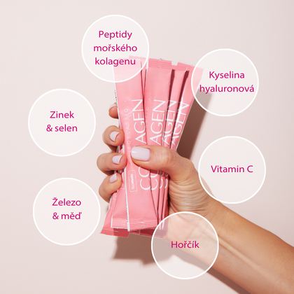 Složení: hydrolyzovaný rybí kolagen, laktát hořečnatý, malinové aroma, sušená šťáva z červené řepy, regulátor kyselosti: kyselina citrónová, glukonát železnatý, kyselina L-askorbová (vitamin C), citrát zinečnatý, hyaluronát sodný, sladidlo: steviol-glykosidy ze stévie, glukonát měďnatý, seleničitan sodný.
